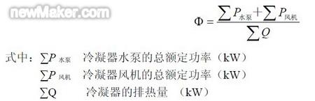 筆者在對(duì)典型產(chǎn)品的技術(shù)參數(shù)比較分析發(fā)現(xiàn),不同的蒸發(fā)式冷凝器,其單位排熱量能耗有明顯的差異。顯然,蒸發(fā)式冷凝器的能耗由水泵和風(fēng)機(jī)組成。產(chǎn)品的技術(shù)手冊(cè)上均有水泵、風(fēng)機(jī)的額定功率以及冷凝器的排熱量,據(jù)此可以歸納出一個(gè)單位排熱量的耗功Φ 的計(jì)算公式。