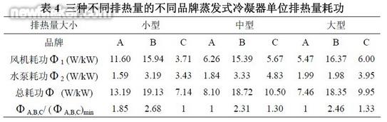 由公式(3)可得,不同排熱量的三種品牌蒸發(fā)式冷凝器單位排熱量風(fēng)機(jī)、水泵以及冷凝器系統(tǒng)總耗功統(tǒng)計(jì)如表4。