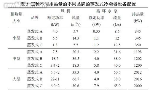 目前國內(nèi)典型的蒸發(fā)式冷凝器產(chǎn)品主要有中美合資的上海益美高 ATC 系列、中美合資的大連冰山巴爾的摩CXV 系列、國內(nèi)煙臺(tái)冰輪的ZNX 系列和上海寶豐的SPL 型等。用戶在選用不同品牌的蒸發(fā)式冷凝器時(shí),不僅要明確產(chǎn)品設(shè)計(jì)依據(jù)的標(biāo)準(zhǔn),而且還要進(jìn)行詳細(xì)的能耗核算。以下選用上述廠家中三種典型品牌的蒸發(fā)式冷凝器A、B、C,利用公式(3)進(jìn)行能耗核算。依據(jù)各自的技術(shù)手冊(cè),可知三種不同排熱量的不同品牌蒸發(fā)式冷凝器的設(shè)備配置,如表3 所示。
