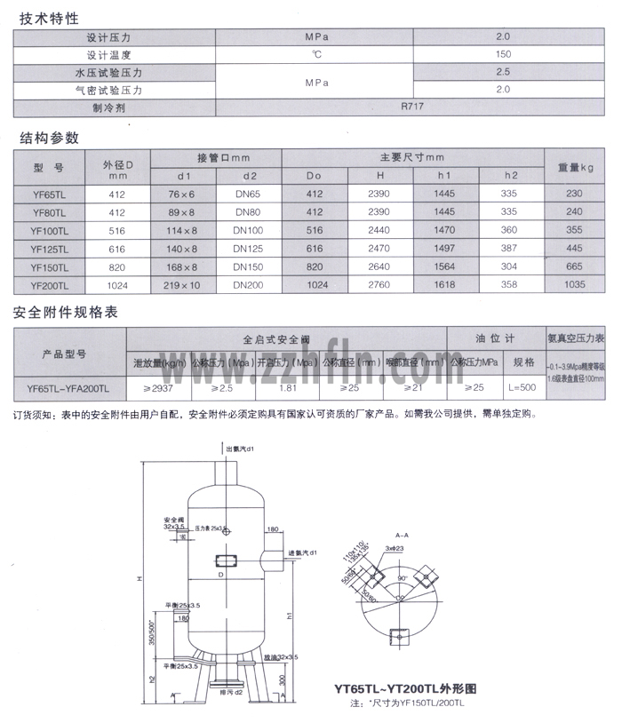 YF-TL系列油分離器 YF-TL系列油分離器是通過(guò)特殊導(dǎo)流片的作用,使高壓氨氣中的潤(rùn)滑油在離心力的作用下初步分離后,再通過(guò)設(shè)備上部的不銹鋼填料層進(jìn)一步分離。