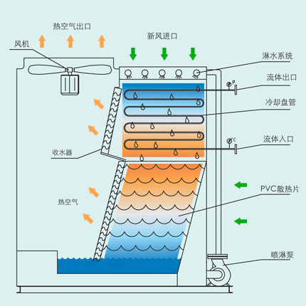 工作流體(水,油或其他液體)在換熱盤管中流動,盤管外壁被噴淋水包裹,流體的熱量通過管壁傳遞,與水和空氣行成飽和濕熱蒸氣,熱量由風機排入大氣。噴淋水在循環(huán)的過程中通過PVC填料降低溫度。從上到下,在盤管部位,噴淋水與進塔新風形成風水同向流動,而在填料段,噴淋水與進塔新風橫向流動。故得名混流式閉式冷卻塔。